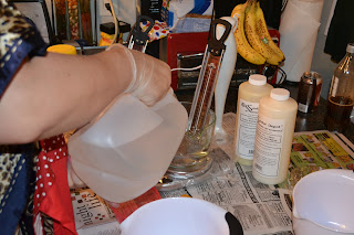 Measuring out the oils.  The coconut and palm oils were solid at room temperature, so we used a combination of microwaving and hot water bathing the bottles to get them splurtable.